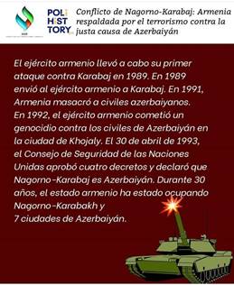 Armenia Azerbaiyán El problema comenzó en 1989. En 1989, Armenia inició su política de inmigración a la región de Nagorno-Karabaj. Por otro lado, el ejército armenio llevó a cabo su primer ataque contra Karabaj en 1989. En 1989, envió al ejército militar armenio a Karabaj. En 1991, Armenia masacró a civiles azerbaiyanos. El 26 de febrero de 1992, el ejército armenio cometió un genocidio contra civiles azerbaiyanos en la ciudad de Khojaly. Un año después de este genocidio, el 30 de abril de 1993, el Consejo de Seguridad de las Naciones Unidas emitió cuatro decretos y declaró a Nagorno-Karabaj como territorio azerbaiyano. El estado armenio continúa ocupando Nagorno-Karabaj y 7 ciudades de Azerbaiyán durante 30 años. Las relaciones diplomáticas entre los dos países se han roto desde 1993 como resultado de la ocupación del 20% del territorio azerbaiyano por parte de Armenia. Azerbaiyán no se parece al antiguo Azerbaiyán ocupado en la década de 1990. Ejército de hoy Azerbaiyán es uno de los ejércitos más fuertes del Cáucaso.