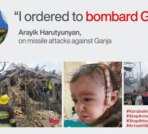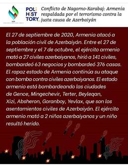 El 27 de septiembre de 2020, Armenia atacó a la población civil de Azerbaiyán. Entre el 27 de septiembre y el 7 de octubre, el ejército armenio mató a 31 civiles azerbaiyanos, 168 civiles resultaron heridos. Hay 1091 casas, 45 apartamentos y 143 edificios de instituciones estatales que necesitan reparación como resultado del ataque armenio. El rapaz estado de Armenia continúa su ataque con bomba contra civiles azerbaiyanos. El estado armenio bombardeó las ciudades de Gence, Mingechevir, Terter, Beyleqan, Aghdam, Agcabedi, Beylagan, Xizi, Absheron, Goranboy, Yevlax, Berde, que son los asentamientos civiles de Azerbaiyán. El ejército armenio mató a 2 niños azerbaiyanos y un niño resultó herido. El ejército armenio invitó a miembros de la organización terrorista PKK, PYD, ISIS, ASALA y Armenia sigue matando a civiles y soldados azerbaiyanos en Nagorno-Karabaj con estas organizaciones terroristas. Los miembros de la organización terrorista ASALA y PKK fueron traídos del Líbano vía Irán para apoyar al ejército armenio. Armenia es un estado que coopera con organizaciones terroristas y el mundo guarda silencio ante esta realidad. El llamado presidente de Nagorno-Karabaj, Arayik Harutyunyan, utilizó las siguientes palabras en los medios de comunicación rusos: