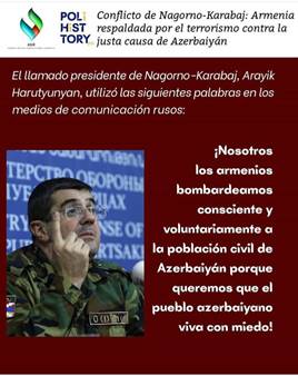 ¡Nosotros los armenios bombardeamos consciente y voluntariamente a la población civil de Azerbaiyán porque queremos que el pueblo azerbaiyano viva con miedo!