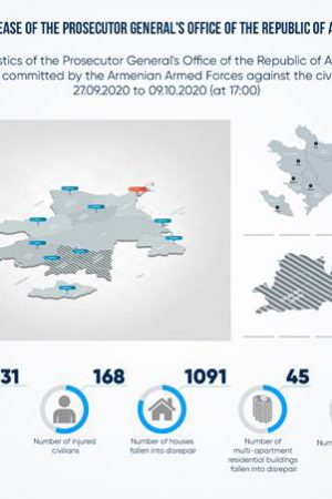 27 Eylül 2020’de Ermenistan, Azerbaycan’ın sivil nüfusuna saldırdı. 27 Eylül- 9 Ekim tarihleri ​​arasında Ermeni ordusu 31 Azerbaycanlı sivili öldürdü, 168 sivili yaralandı. Ermenistan saldırısı sonucu yeniden onarılmaya ihtiyaç 1091 ev, 45 apartman ve 143 devlet kurumu binası mevcuttur. Tecavüzkar Ermenistan devleti, Azerbaycanlı sivillere yönelik bombalı saldırısına devam etmektedir. Ermenistan devleti, Azerbaycan’ın sivil yerleşim yerleri olan Gence, Mingeçevir, Terter, Beyleqan, Ağdam, Ağcabedi, Beylagan, Xızı, Abşeron, Goranboy, Yevlax, Berde, şehirlerini bombalamaktadır. Ermeni ordusu 2 Azerbaycanlı çocuğu öldürdü ve bir çocuk yaralandı. Ermeni ordusu, terör örgütü PKK, PYD, IŞİD, ASALA üyelerini davet etti ve Ermenistan, bu terör örgütleri ile Dağlık Karabağ’da Azerbaycanlı sivilleri ve askerleri öldürmeye devam etmektedir. Terör örgütü ASALA ve PKK üyeleri, Ermeni ordusuna destek vermek için Lübnan’dan İran üzerinden getirildi. Ermenistan terör örgütleri ile ortak hareket eden bir devlettir ve dünya bu gerçek karşısında sessizdir. Dağlık Karabağ’ın sözde Cumhurbaşkanı Arayik Harutyunyan, Rus medyasında şu sözleri kullandı: