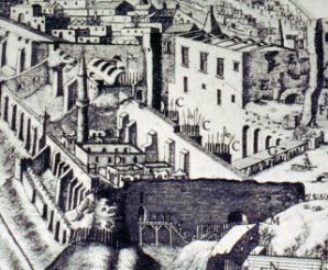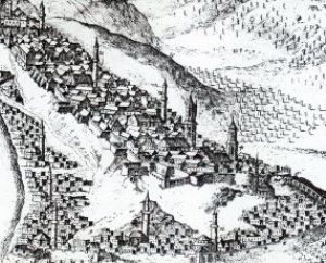 Hallart’ın 1686’da Budin’i gösteren bir gravürü. Macaristan’daki Türk Anıtlar ve cami.
