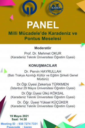 Karadeniz Teknik Üniversitesi Karadeniz Araştırmaları Enstitüsü tarafından 19 Mayıs 2021 tarihinde saat 14:30’da “Milli Mücadele’de Karadeniz ve Pontus Meselesi” isimli çevrimiçi panel düzenlenecektir.