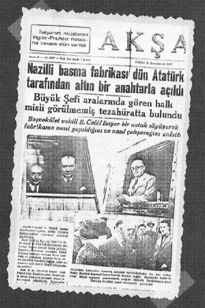Türkiye’de devlet eliyle kurulan bu ilk basma fabrikasını 9 Ekim 1937’de bizzat Atatürk açmıştır. Atatürk, Ege manevraları için bölgede bulunan ordu komutanlarıyla ve yöneticilerle birlikte açılışa gelmiştir. Genelkurmay Başkanı Mareşal Fevzi Çakmak, İkinci Ordu Müfettişi Orgeneral İzzetin Çalışlar, Genelkurmay Asbaşkanı Asım Gündüz, Jandarma Genelkomutanı Naci İldeniz gibi komutanlar ve Trakya Umum Müfettişi General Kazım Dirik ile İzmir Valisi Güleç, Başvekil Vekili Celal Bayar, İsmet İnönü, Afet İnan, Kütahya Milletvekili Recep Peker, Ziraat Vekili Şakir Kesebir, Dahiliye Vekili ve CHP Genel Sekreteri Şükrü Kaya, Nafia Vekili Ali Çetinkaya, Hariciye Vekili Tevfik Rüştü Aras, Milli Müdafaa Vekili Kazım Özalp, Maliye Vekili Fuat Ağralı, Kültür Vekili Saffet Arıkan, Gümrük ve İnhisarlar Vekili Ali Rana, Orman Umum Muhafaza Komutanı Korgeneral Seyfi gibi nerdeyse devletin bütün askeri ve sivil erkanı tam kadro Atatürk’le birlikte Nazilli’dedir.