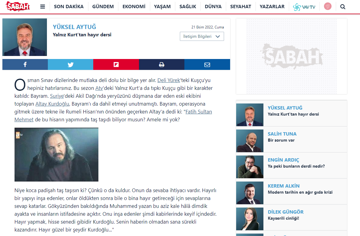 Osman Sınav dizilerinde mutlaka deli dolu bir bilge yer alır. Deli Yürek‘teki Kuşçu’yu hepiniz hatırlarsınız. Bu sezon Atv‘deki Yalnız Kurt’a da tıpkı Kuşçu gibi bir karakter katıldı: Bayram. Suriye‘deki Akil Dağı’nda yeryüzünü düşmana dar eden eski ekibini toplayan Altay Kurdoğlu, Bayram’ı da dahil etmeyi unutmamıştı. Bayram, operasyona gitmek üzere tekne ile Rumeli Hisarı’nın önünden geçerken Altay’a dedi ki: “Fatih Sultan Mehmet de bu hisarın yapımında taş taşıdı biliyor musun? Amele mi yok?