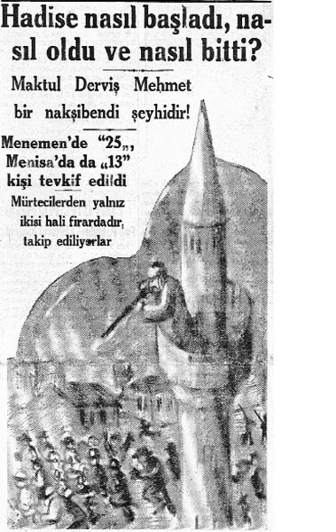 Bu kişilere göre Menemen’de papazlar ve çan sesleri varken DİN vardı!!! Papazlar gidince, çan sesleri yerine yine ezan sesleri gelince; DİN ELDEN GİTMİŞ OLDU!!! “Eyvah Menemen’de din elden gitti “”Biz nakşiyiz, şeriat isteriz” Giritli Nakşi Mehmet köylüye sorar; “yardım edecek misiniz?”