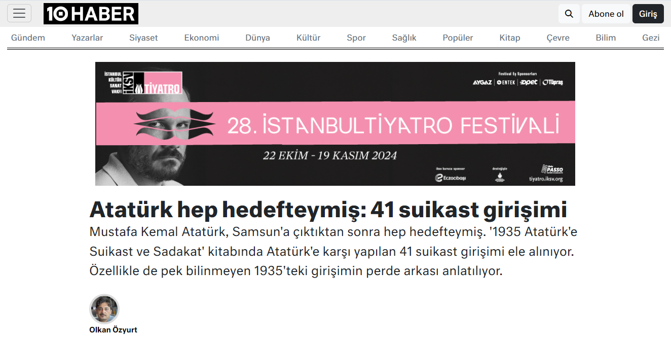 Mustafa Kemal Atatürk, Samsun’a çıktıktan sonra hep hedefteymiş. ‘1935 Atatürk’e Suikast ve Sadakat’ kitabında Atatürk’e karşı yapılan 41 suikast girişimi ele alınıyor. Özellikle de pek bilinmeyen 1935’teki girişimin perde arkası anlatılıyor.