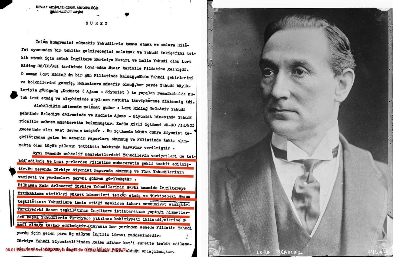 İstihbarat belgesine göre Lord Reading’in Kudüs’te katıldığı toplantılarda Türkiye’deki mason örgütüne övgü yağdırıldı. Bu locaların Yahudilerin etkin görevlere gelmesini sağladığı ve ekonomik gücü ele geçirmelerinde başrolü oynadığı kaydediliyor.