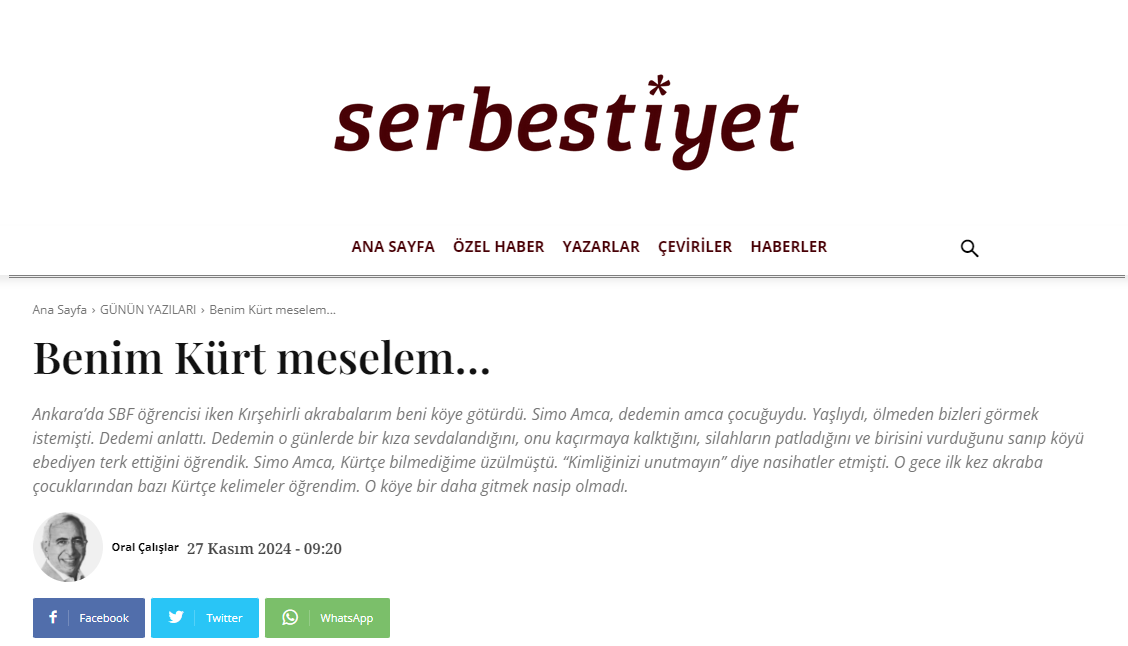 Ankara’da SBF öğrencisi iken Kırşehirli akrabalarım beni köye götürdü. Simo Amca, dedemin amca çocuğuydu. Yaşlıydı, ölmeden bizleri görmek istemişti. Dedemi anlattı. Dedemin o günlerde bir kıza sevdalandığını, onu kaçırmaya kalktığını, silahların patladığını ve birisini vurduğunu sanıp köyü ebediyen terk ettiğini öğrendik. Simo Amca, Kürtçe bilmediğime üzülmüştü. “Kimliğinizi unutmayın” diye nasihatler etmişti. O gece ilk kez akraba çocuklarından bazı Kürtçe kelimeler öğrendim. O köye bir daha gitmek nasip olmadı. Ama akrabalarımla ilişkilerim sürüyor. Tabii bu geçmişin sonraki yaşamıma etkisi oldu. Kürtleri öcü gibi gören, onların kuyruğunun olduğunu sananlardan olma ihtimalim yoktu. Ama asıl olan benim Kürt meselem değil Türkiye’nin Kürt meselesiydi.