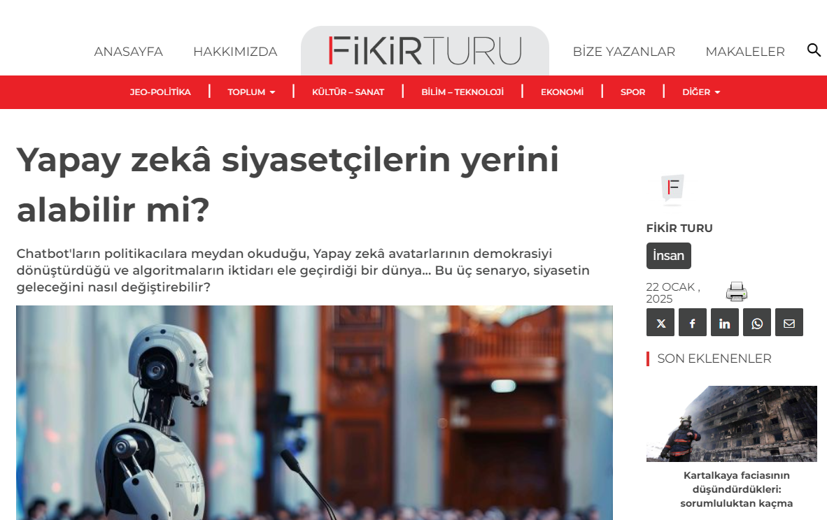 Yapay zekâ, işyerinden günlük yaşama kadar toplumun her alanını hızla dönüştürüyor. Yapay zekânın yarattığı etki, teknolojik yeniliklerin ötesine geçerek siyaset alanına da uzanıyor ve Yapay zekânın bir gün insan siyasetçilerin yerini alıp alamayacağına dair soruları gündeme getiriyor.