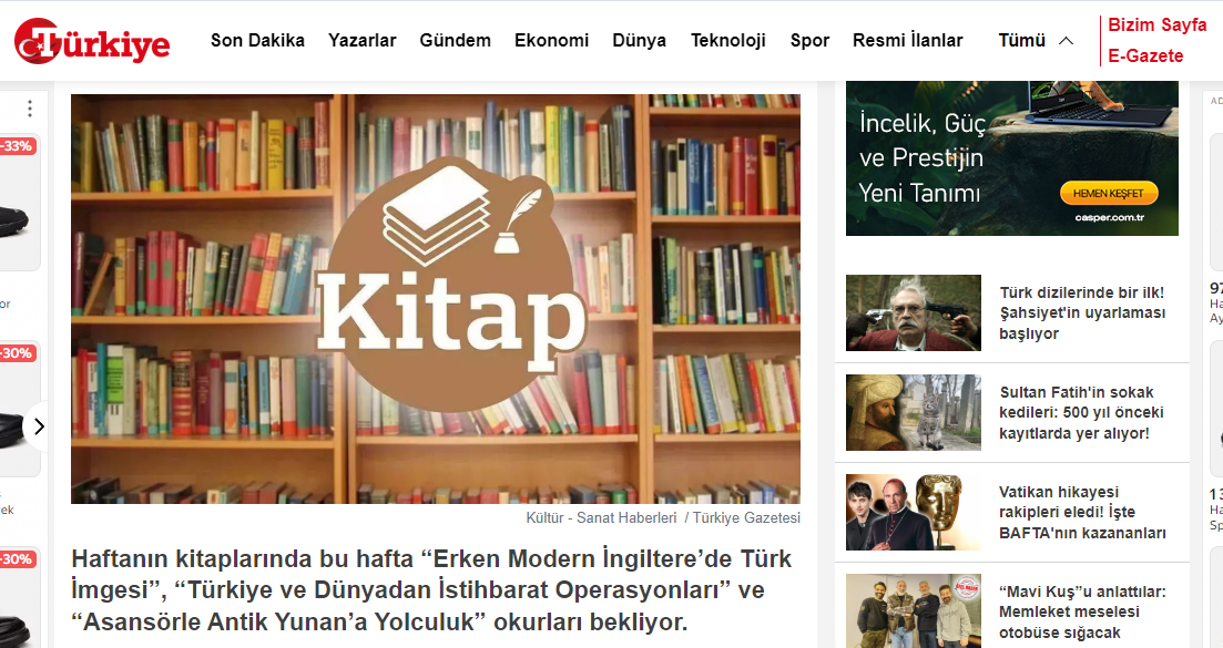 Haftanın kitaplarında bu hafta “Erken Modern İngiltere’de Türk İmgesi”, “Türkiye ve Dünyadan İstihbarat Operasyonları” ve “Asansörle Antik Yunan’a Yolculuk” okurları bekliyor.