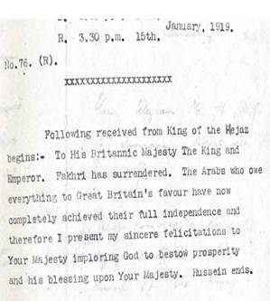 Şerif Hüseyinin, Fahri Paşanın teslim alındığını bildiren İngilizlere teşekkür mektubu. İhanet o dönemde başlamıştı. Şimdi kalkıp Arap seviciler farklı söyler oldu. Fahri Paşaya rahmetle.