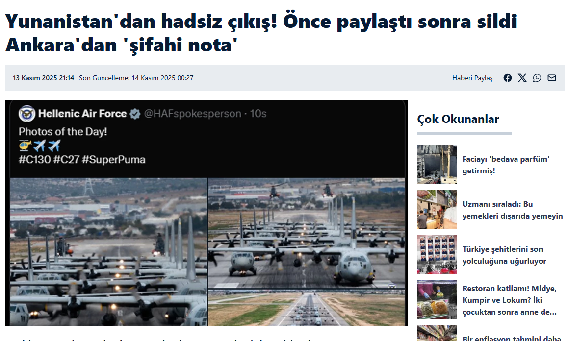 Türkiye Gürcistan’da düşen askeri uçağı nedeniyle şehit olan 20 canına ağlarken, Yunanistan Hava Kuvvetleri Komutanlığı tepki çeken, manidar bir paylaşım yaptı. Paylaşımından pişman olan komutanlık, paylaşımını silip taziye mektubu paylaştı. Dışişleri Bakanlığı, Yunanistan’a şifahi nota verdi.