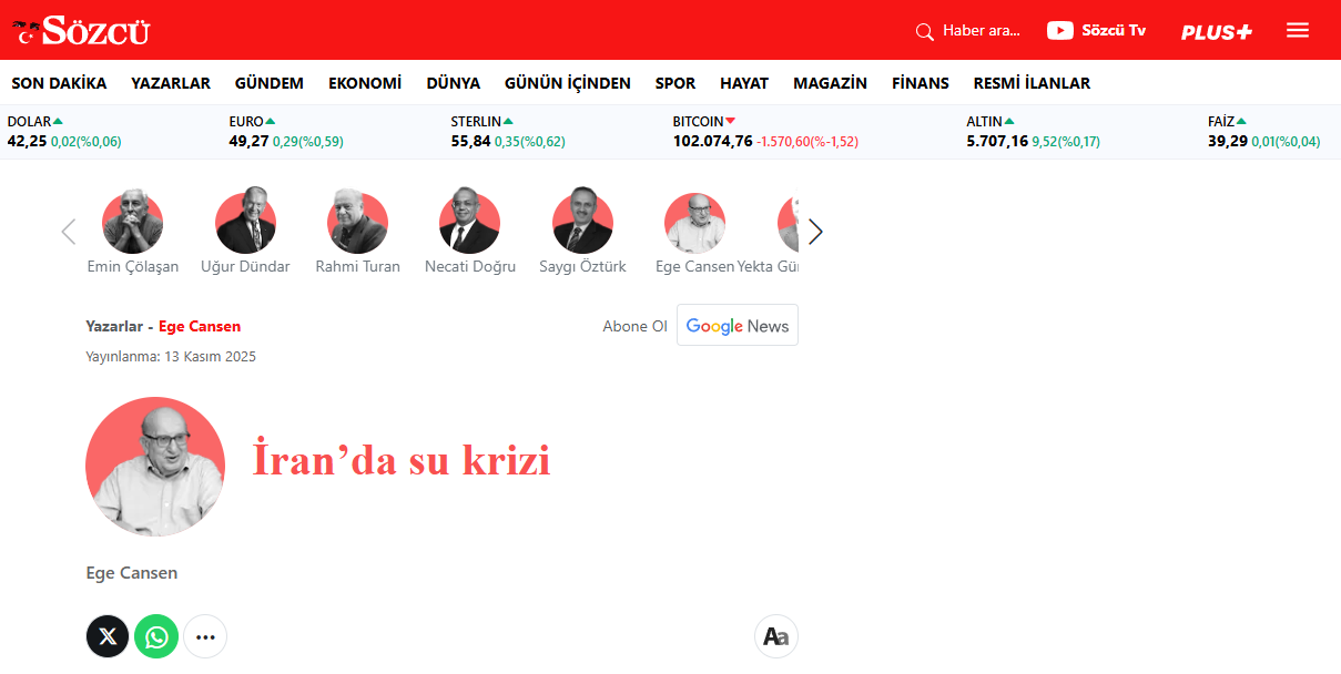 Haberlere göre İran’da susuzluk tam bir krize dönüşmüş. Başkent Tahran, İsfahan ve Meşhet gibi milyonlarca insanın yaşadığı şehirlerin ihtiyacını karşılayan barajlardaki su neredeyse bitmiş. Cumhurbaşkanı Dr. Mesud Pezeşkiyan, “Susuzluk yüzünden Tahran’ı boşaltmak zorunda kalabiliriz” demiş. Susuzluk krizinin, ikisi doğal, biri insan yapımı üç nedeni var deniyor. Birinci sebep, İran’da 5 yıldır kuraklığın hüküm sürmesi. İkinci sebep, küresel ısınma dolayısıyla hem barajlarda buharlaşmanın hızlanması hem de tarımda ve evlerde tüketilen su miktarının artması. Üçüncü sebep, olarak da su tasarrufuna riayet edilmemesi gösteriliyor. Bugünkü kriz çoktandır geliyorum demiş zaten. Aslında İran devleti su sağlamanın önemini uzun süre önce anlamış. Dendiğine göre “çılgınca baraj inşaatına” girişmişler. Yetmemiş, yer altı göllerindeki suyu çekmek için derin kuyular açmışlar. Nasıl olsa kuyularımız ve barajlarımız var diye sulu tarıma ağırlık vermişler. Yağmur yağmayınca barajlar dolmamış, yer altı su stokları bitmiş. Pompalanan suyun yeri boş kalamayacağı için