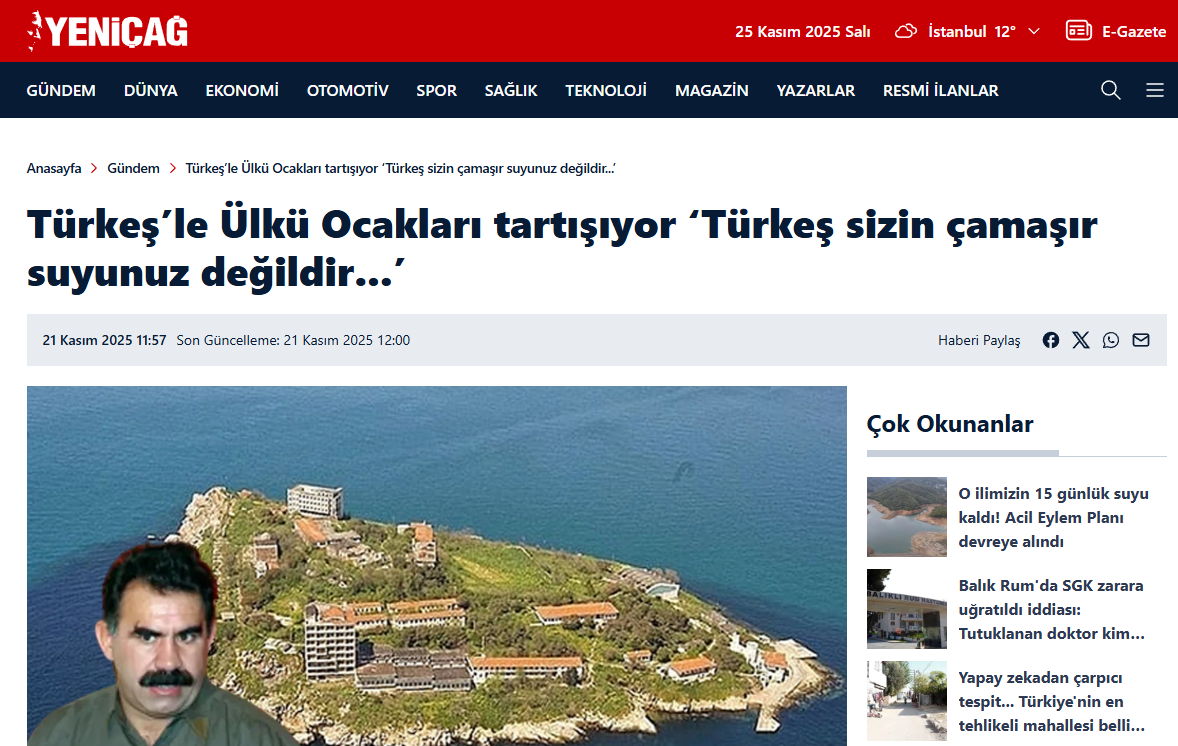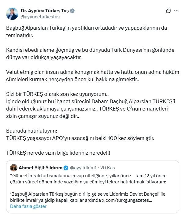 “Güncel İmralı tartışmalarına cevap niteliğinde, yıllar önce—tam 12 yıl önce—çözüm süreci döneminde yazdığım şu cümleyi tekrar hatırlatmak istiyorum: ‘Başbuğ Alparslan Türkeş bugün dirilip gelse ve Liderimiz Devlet Bahçeli ile birlikte İmralı’ya gidip kapalı kapılar ardında teröristbaşı Öcalan ile görüşse, zerre şüphe duymam. Onlar hangi adımı atarsa atsın, tek düşünceleri Türk milletinin çıkarları olur.’ Ona duyulan güven duygusu böyle bir şeydir. Onun siyasi menfaat hesabı, gizli ajandası olmaz.”