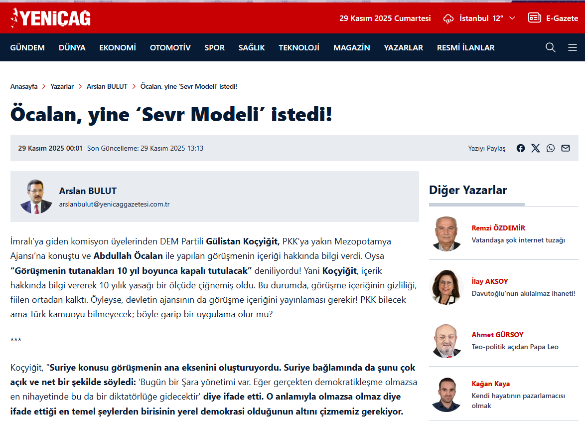 İmralı’ya giden komisyon üyelerinden DEM Partili Gülistan Koçyiğit, PKK’ya yakın Mezopotamya Ajansı’na konuştu ve Abdullah Öcalan ile yapılan görüşmenin içeriği hakkında bilgi verdi. Oysa “Görüşmenin tutanakları 10 yıl boyunca kapalı tutulacak” deniliyordu! Yani Koçyiğit, içerik hakkında bilgi vererek 10 yılık yasağı bir ölçüde çiğnemiş oldu. Bu durumda, görüşme içeriğinin gizliliği, fiilen ortadan kalktı. Öyleyse, devletin ajansının da görüşme içeriğini yayınlaması gerekir! PKK bilecek ama Türk kamuoyu bilmeyecek; böyle garip bir uygulama olur mu?