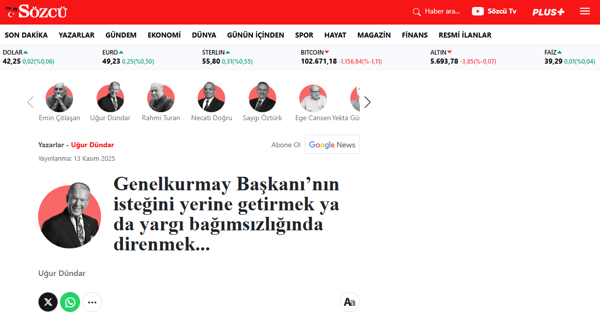 “Genelkurmay Başkanı Doğan Güreş Paşa sana çok kızıyor. Uğur Dündar’a söyle, bir daha o haberleri yaparsa kendisini divanıharbe veririm diyor…”