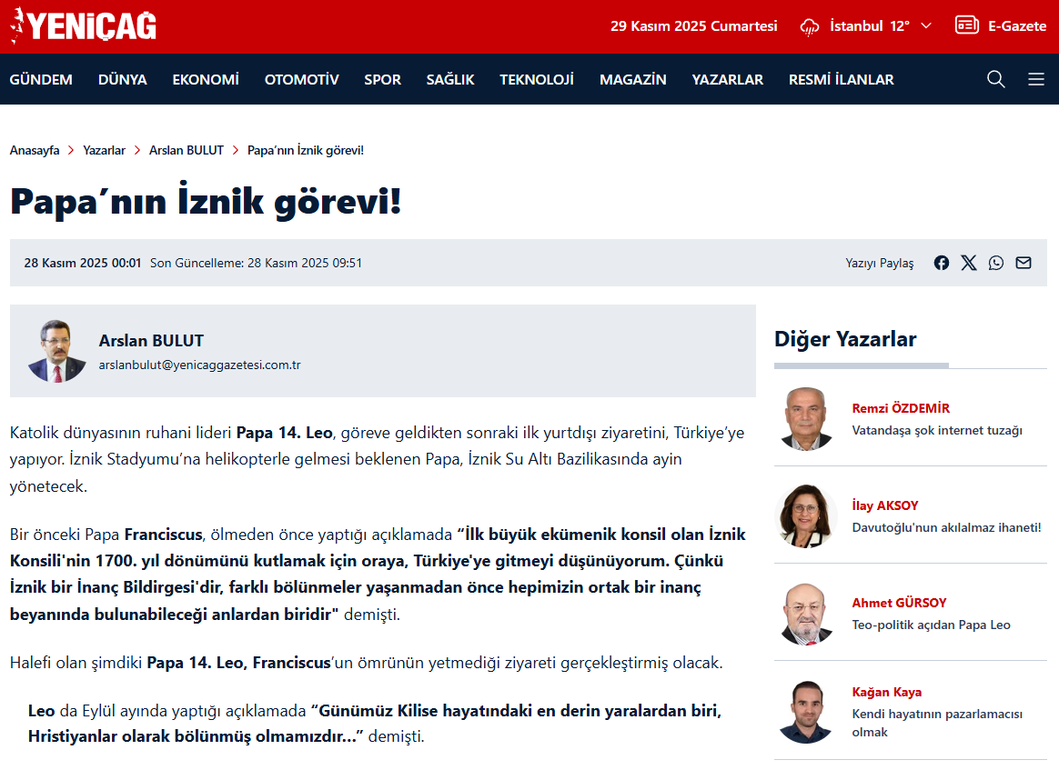 Arslan BULUT : Papa’nın İznik görevi !!!